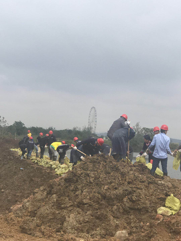 由于道路原因,装载机、挖机无法上到围堰,情况紧急,容不得半点犹豫,现场人员果断采取人工运土,15个人一组填充编织袋,40人另一组负责运送和堆积沙袋。时间一分一秒流逝,抢险队员来回在泥土里穿行,装沙袋、运沙袋、垒沙袋,大家齐心协力、默契的接力……5个小过去了原本的围堰上修筑起了一道“白色防线”,大家一直悬着的心才稍微放松下来,阴霾的天空也露出了久违的阳光!